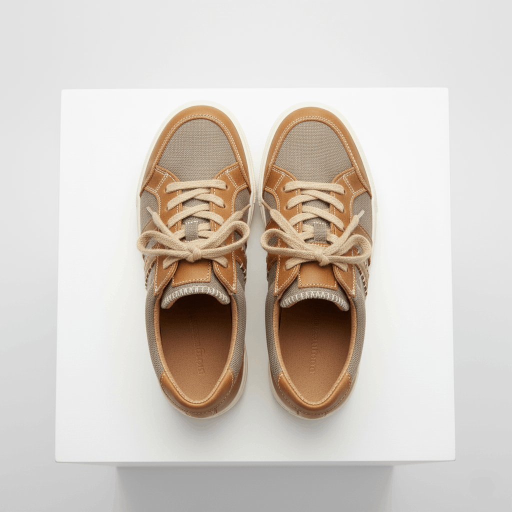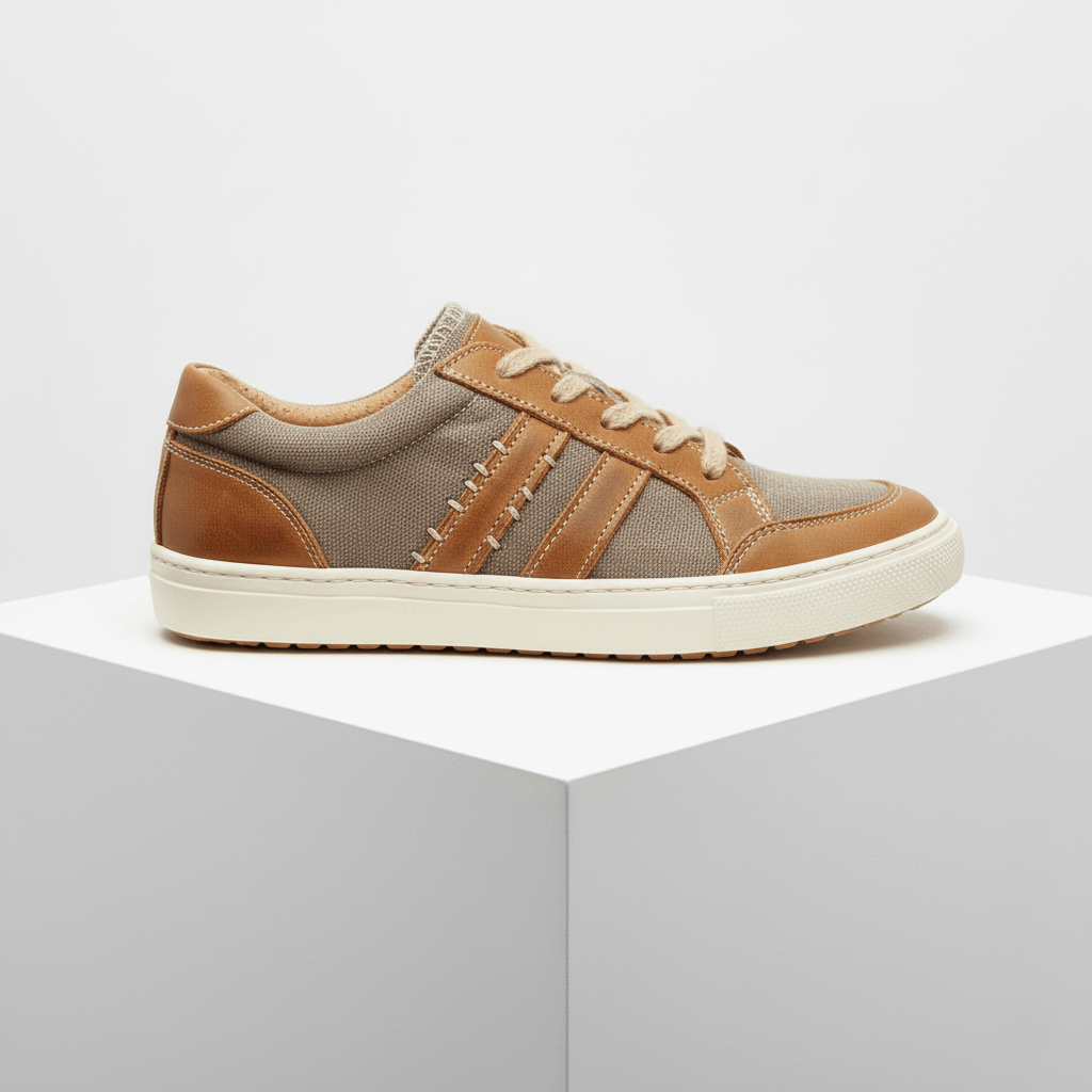 Discover your new go-to with the CraftLine Urban Stitch Sneaker. This low-top silhouette combines sturdy taupe canvas with caramel brown leather overlays, highlighted by handcrafted contrast stitching for a unique, artisan-inspired look. The soft padded collar and cushioned insole keep you comfortable on busy days, while a grippy rubber sole ensures urban-ready traction. Pair them with denim or casual pants for a fresh take on modern style and comfort.