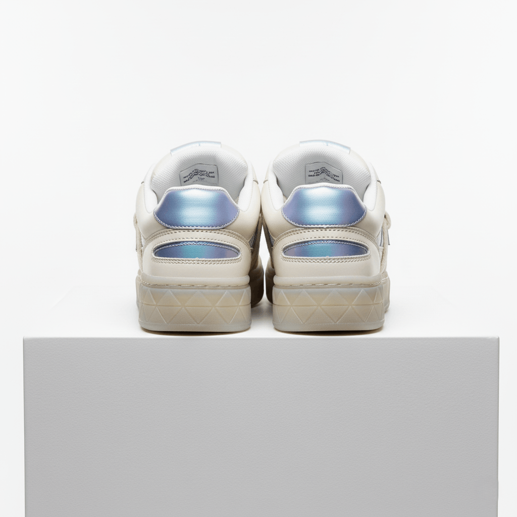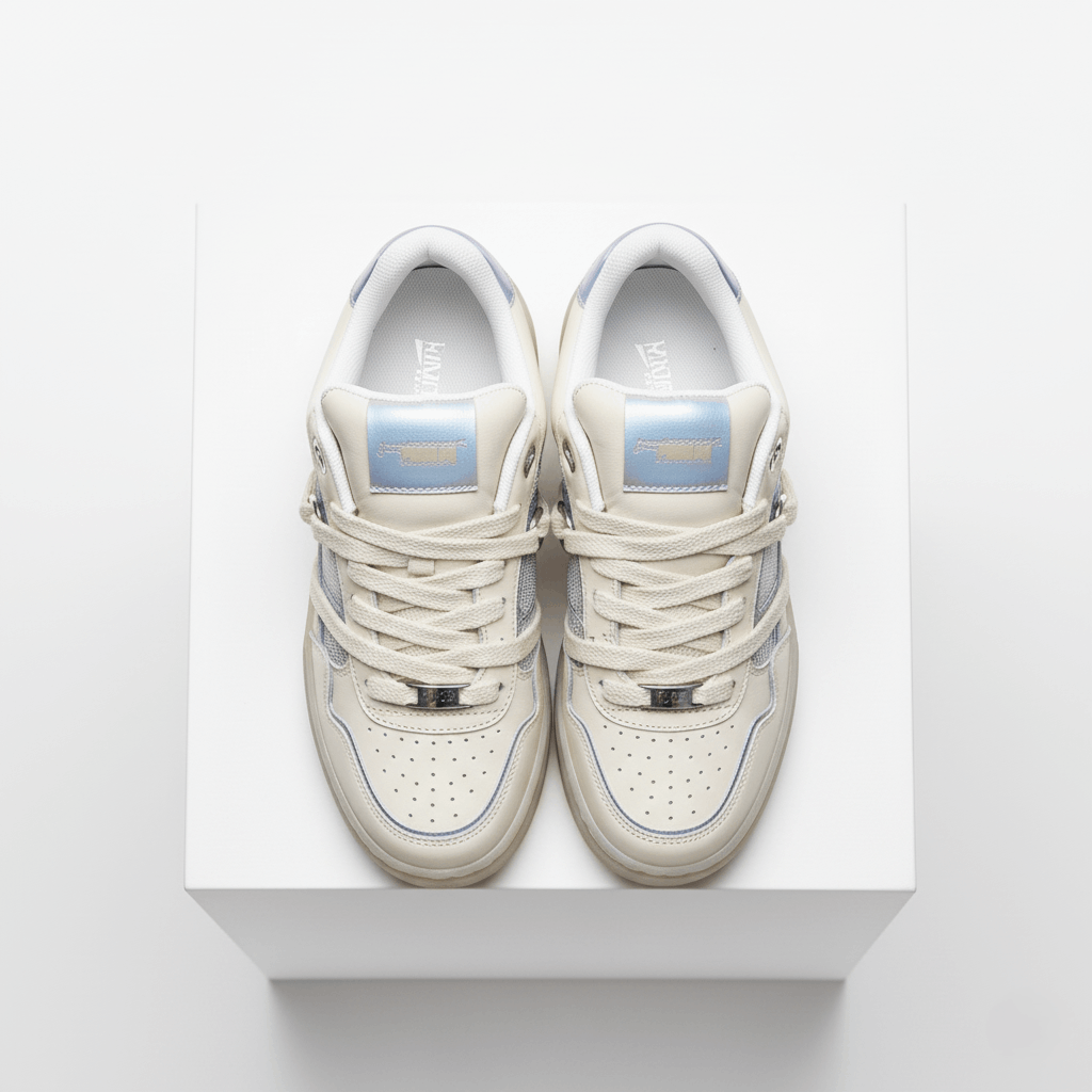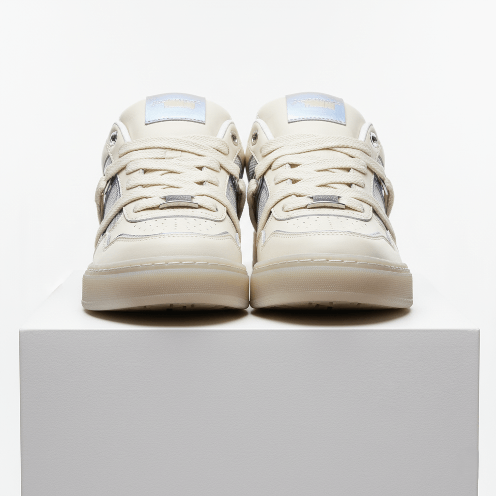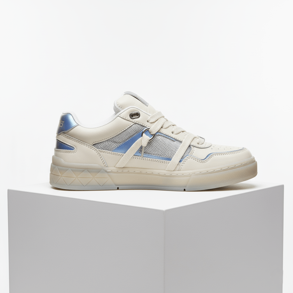 Step up urban style with the Glacier Grid Court Sneaker. Blending soft cream leather with silver-blue mesh and icy metallic overlays, these low-tops fuse retro sports inspiration and futuristic flair. Unique geometric embossing at the midsole, perforated toe box for breathability, and a reinforced lace system make these sneakers stylish and practical for every day. The padded collar and supportive footbed ensure lasting comfort, whether you’re exploring the city or dressing up casual looks.