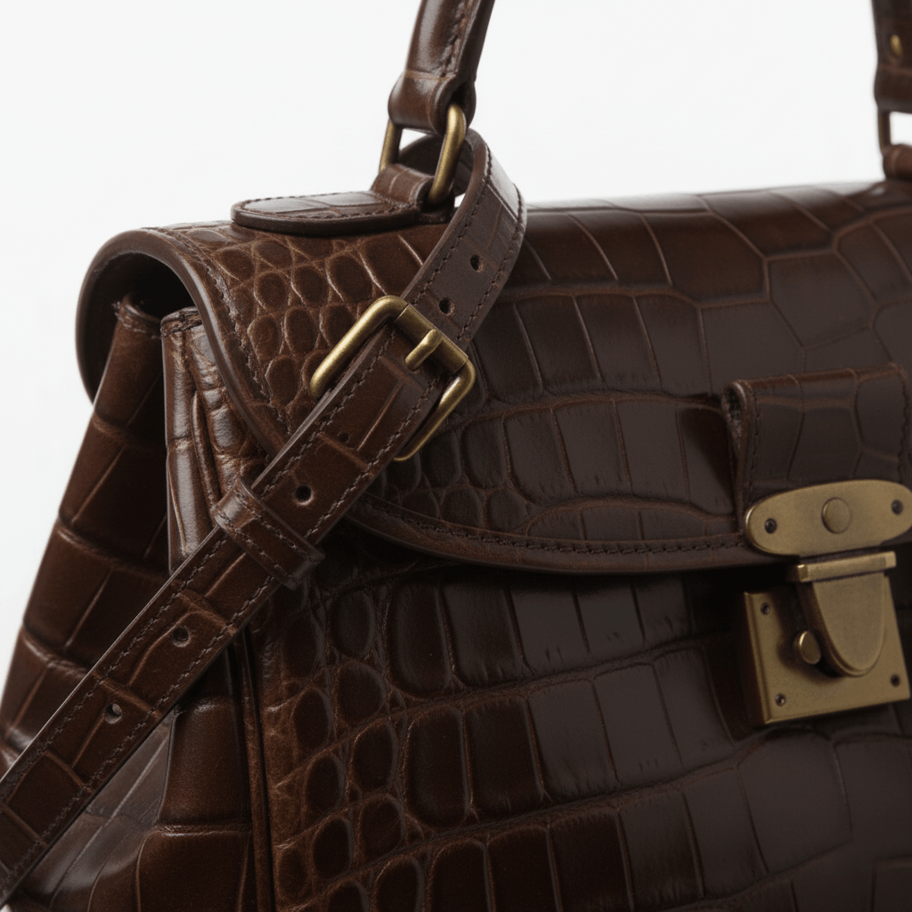 A refined croc-embossed leather handbag in rich mocha, finished with antique brass hardware and classic structured silhouette.